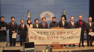 [뉴스웍스=원성훈 기자] 국민의힘 초·재선 의원 25명이 12·3 비상계엄 1주년이 되는 3일 "성찰과 반성 그리고 뼈 깎는 혁신으로 거듭날 것"이라며 사과했다. 이는 국민의힘 장동혁 대표가 아직 당 안팎의 '계엄 사과' 요구에 대한 입장을 내놓지 않은 가운데 나온 것이어서 관심이 쏠린다.국민의힘 박정하·배준영 의원을 비롯해 조은희 의원 등은 이날 국회소통관 기자회견에서 "오늘 우리는 12·3 비상계엄 1년을 맞으면서 비상계엄에 대한 우리의 입장을 분명히 밝히고, 그동안 우리의 잘못을 반성하고 국민께 사죄드리기 위해 이 자리에 섰다