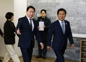 민주신문=전주원 기자|최태원 SK그룹 회장이 대한상공회의소 회장 자격으로 더불어민주당 지도부를 만나 지역발전 방안에 대해 논의했다.대한상의는 16일 서울 중구 상의회관에서 간담회를 개최했다. 정청래 민주당 대표 및 정책 지도부가 참석했다. 지난 9월 이후 3개월 만에 다시 마련된 자리다.재계에서는 최 회장, 이형희 SK 부회장, 박승희 삼성전자 사장, 정연인 두산에너빌리티 부회장, 김동욱 현대자동차 부사장 등이 함께 했다.민주당 측에서는 정 대표를 비롯해 서삼석 최고위원, 한정애 정책위의장, 김원이 산자중기위 간사 등이 더불어민주당